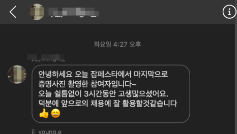 지난 채용박람회에 와주셨던 구직자분께서 DM을 보내주셨습니다. 고생한 보람이 느껴지는 순간입니다. 앞으로도 좋은 사진, 멋진 이미지들을 만들기위해~ 노력하겠습니다.